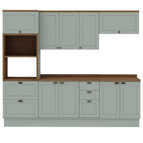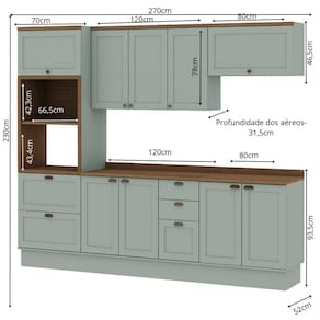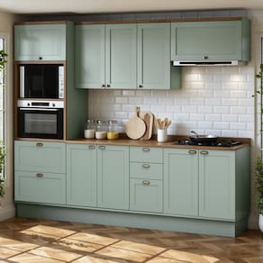 A Iluminata é perfeita para quem quer viver momentos especiais em uma cozinha que une beleza, conforto e qualidade. Acabamento da Prateleira: Pintura Texturizada UV Escala de Brilho da Prateleira: Fosco Acabamento da Gaveta: BP Melamínico Escala de Brilho da Gaveta: Fosco Material do Puxador da Gaveta: ABS Acabamento da Porta: BP Melamínico Escala de Brilho da Porta: Fosco Material do Puxador da Porta: ABS Acabamento dos Pés: Pintura Acompanha Rodapé Decorativo: Sim Acompanha Tampo: Sim Altura dos Pés: 17 cm Altura Máxima dos Pés: 17.0000 Ambiente Principal: Cozinha Balcão Suporta Pia: Sim codigo_ean: 7900288325457 Complexidade da Montagem: Alta: deve ser montado por um montador especializado Cor: Verde Mint/Ébano Cor do Produto: Verde Mint/Ébano Cor Flex: Não Cor Interna: Verde Mint Escala de Brilho: Fosco Espessura do Material da Estrutura: 1,5 mm Espessura do Tampo: 2,5 mm Gaveta com Chave: Não Informações Complementares: Cozinha Completa Modulada 5 Peças 100% MDF Modelo Americano Provençal Itens Inclusos: 1 Cozinha Completa, Kit Ferragens e Manual de Montagem Linha ou Coleção: Iluminata Manual de Montagem e Instalação: https://product-hub-prd.madeiramadeira.com.br/115538398/documents/6aadd7fe-9ffe-46f7-a777-56cd6b07c18f337937873417703178126351.pdf Marca: Genialflex Material da Corrediça: Metálica Material da Dobradiça/Corrediça da Porta: Metálica Material da Gaveta: MDF Material da Porta: MDF Material da Prateleira: MDF Material do Fundo: MDF Material do Tampo: MDF Material dos Pés: ABS Medida de cada item (A x L x P): Torre Forno e Micro(230x70x52)Aéreo de 120cm(78x120x31,5)Aéreo de 80cm(46,5x80x31,5) Balcão de 120 com tampo (93,5x120x52)Balcão de 80cm com tampo(93,5x80x52) modular: Sim Montagem Flex: Sim, os módulos podem ser posicionados em lugares diferentes. Necessita Montagem: Sim O Balcão Acompanha Pia: Não Origem do Produto: Nacional Pés Reguláveis: Sim Peso: 199 kg Peso Máximo por Gaveta: 4 kg Peso Máximo por Prateleira: 5 kg Possui Pés: 13 Possui Portas: Sim Possui Prateleiras: Sim Possui recorte para Cooktop: Não Possui Rodízio: Não Possui Vidro: Não Produto Montado: Sim Recomendações de Uso, Manutenção e Limpeza: LIMPAR COM PANO UMEDECIDO E NUMERO DAS PEÇAS RETIRAR COM ALCOOL Sapatas Niveladoras: Sim Sistema de Montagem: Parafusos e Cavilhas Suporta Até (kg): 70 kg Tamanho Indicado da Pia: 120 Tipo de Corrediça da Gaveta: Metálica Telescópica Tipo de Dobradiça da Porta: Soft close Tipo de Puxador da Gaveta: Externo Tipo de Puxador da Porta: Externo