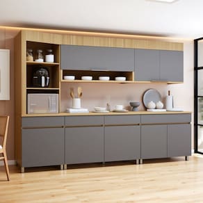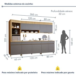 Pode ser utilizado em outro ambiente? Claro, com criatividade, ele pode ser utilizado em vários ambientes. Acabamento da Prateleira: Impressão Escala de Brilho da Prateleira: Semi-Brilho Acabamento da Gaveta: Impressão Escala de Brilho da Gaveta: Semi-Brilho Acabamento da Porta: Impressão Escala de Brilho da Porta: Semi-Brilho Material do Puxador da Porta: Alumínio Acabamento dos Pés: Pintura Acompanha Tampo: Sim Altura dos Pés: 10 cm Altura Máxima dos Pés: 10.0000 Ambiente Principal: Cozinha Balcão Suporta Pia: Não codigo_ean: 7900288293367 Complexidade da Montagem: Alta: deve ser montado por um montador especializado Cor: Carvalho/Titânio Cor do Produto: Carvalho/Titânio Escala de Brilho: Semi-Brilho Espessura do Tampo: 25 mm Gaveta com Chave: Não Itens Inclusos: 1 Cozinha Completa, Kit Ferragens e Manual de Montagem Linha ou Coleção: Realeza Premium Manual de Montagem e Instalação: https://product-hub-prd.madeiramadeira.com.br/801691653/documents/2edcc59d-37fd-4296-94a1-76d8aa38fb76334148473217655455895108.pdf Marca: Nesher Móveis Material da Corrediça: Metálica Material da Dobradiça/Corrediça da Porta: Metálica Material da Gaveta: MDF Material da Porta: MDF Material da Prateleira: MDF Material do Tampo: MDF Material dos Pés: ABS Medida de cada item (A x L x P): Aéreo 2 portas: 78x80x32; aéreo 1 porta: 78x120x32; Balcão 1 gaveta: 91x80x45; balcao 2 gavetas: 91x120x45; Torre quente: 221x65x45. modular: Sim Montagem Flex: Torre angular com montagem flex Necessita Montagem: Sim O Balcão Acompanha Pia: Não Origem do Produto: Nacional Pés Reguláveis: Sim Peso: 174,08 kg Peso Máximo por Gaveta: 5 kg Peso Máximo por Prateleira: 15 kg Possui Pés: 13 Possui Portas: Sim Possui Prateleiras: Sim Possui recorte para Cooktop: Não Possui Rodízio: Não Possui Vidro: Não Produto Montado: Sim Recomendações de Uso, Manutenção e Limpeza: Utilizar pano macio levemente umedecido e na sequencia pano macio seco Sapatas Niveladoras: Sim Sistema de Montagem: Parafusos e Cavilhas Tipo de Corrediça da Gaveta: Metálica Telescópica Tipo de Dobradiça da Porta: 35 mm Tipo de Puxador da Gaveta: Embutido Tipo de Puxador da Porta: Externo Marca: Não Informado