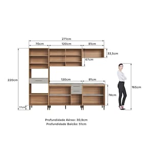 Medida de cada item (A x L x P): Balcão Torre 0,70m – 220x70x51cm – Aéreo 0,80m – 33,5x81x30,9cm – Balcão 0,80m – 91x81x51cm – Aéreo 1,20m – 67x120x30,9cm – Balcão pia 1,20m – 91x120x51cm – Tampo – 15x120x51cm