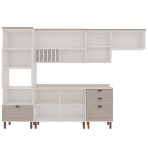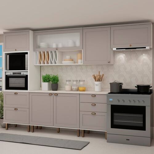 Inclui porta-pratos e vidros no estilo mini boreal, agregando charme e funcionalidade ao ambiente. Acabamento da Prateleira: Pintura Escala de Brilho da Prateleira: Fosco Acabamento da Gaveta: Pintura Texturizada UV Escala de Brilho da Gaveta: Fosco Material do Puxador da Gaveta: PVC Acabamento da Porta: Pintura Texturizada UV Escala de Brilho da Porta: Fosco Material do Puxador da Porta: ABS Acabamento dos Pés: Pintura Acompanha Rodapé Decorativo: Não Acompanha Tampo: Sim Altura dos Pés: 17 cm Altura Máxima dos Pés: 17.0000 Ambiente Principal: Cozinha Balcão Suporta Pia: Sim codigo_ean: 7900288238979 Complexidade da Montagem: Média: pode ser montado por mais de uma pessoa e/ou necessite de maior conhecimento para montagem Cor: Branco/Cinza Cor do Produto: Branco/Cinza Cor Flex: Não Cor Interna: Branco Escala de Brilho: Fosco Espessura do Material da Estrutura: 15 mm Espessura do Tampo: 25 mm Gaveta com Chave: Não Informações Complementares: Cozinha Completa 6 Peças Torre Quente 2 Balcões 3 Armários Aéreos Iluminata Genialflex Itens Inclusos: 1 Cozinha Completa, Kit Ferragens e Manual de Montagem Linha ou Coleção: Iluminata Manual de Montagem e Instalação: https://product-hub-prd.madeiramadeira.com.br/658007275/documents/402d346b-40a7-4e64-8b61-cdc4d2f004e46dff92ad1092a0981387cb0033.pdf Marca: Genialflex Material da Corrediça: Metálica Material da Dobradiça/Corrediça da Porta: Metálica Material da Gaveta: MDF Material da Porta: MDF Material da Prateleira: MDF Material do Fundo: MDF Material do Tampo: MDF Material dos Pés: ABS Medida de cada item (A x L x P): Torre forno e Microondas 230x70x52| Aéreo de 120 78x120x31,5| Balcão de 120 91x120x52|Aéreo de 60 78x60x31,5| Balcão de 60 cm 3 gavetas 91x60x52| Aéreo basculante 80cm 46,5x80x31,5 modular: Sim Montagem Flex: Não Necessita Montagem: Sim O Balcão Acompanha Pia: Não Origem do Produto: Nacional Pés Reguláveis: Sim Peso: 120,95 kg Peso Máximo por Gaveta: 5 kg Peso Máximo por Prateleira: 5 kg Possui Pés: 12 Possui Portas: Sim Possui Prateleiras: Sim Possui recorte para Cooktop: Não Possui Rodízio: Não Possui Vidro: Sim Produto Montado: Sim Recomendações de Uso, Manutenção e Limpeza: Limpar com pano umedecido Sapatas Niveladoras: Não Sistema de Montagem: Minifix e Parafusos Suporta Até (kg): 60 kg Tamanho Indicado da Pia: 120 Tipo de Corrediça da Gaveta: Metálica Telescópica Tipo de Dobradiça da Porta: Soft close Tipo de Dobradiça/Corrediça da Porta: Soft Close Tipo de Puxador da Gaveta: Externo Tipo de Puxador da Porta: Externo