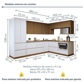 Medida de cada item (A x L x P): Paneleiro 2 Portas 2 Gavetas 70 Cm A: 228 Cm P: 52 Cm L: 70 Cm Arm. Micro-ondas 1 Porta Basc. 70 Cm A: 80 Cm P: 42 Cm L: 70 Cm Armário Aéreo 2 Portas 120 Cm A: 80 Cm P: 32 Cm L: 120 Cm Aéreo Geladeira 1 Porta Basc. 80 Cm A: 40 Cm P: 32 Cm L: 80 Cm Aéreo Canto Dir/esq 2 Portas 92x52 Cm A: 80 Cm P: 52 Cm L: 92 Cm Balcão 1 Porta 4 Gavetas 120 Cm A: 91 Cm P: 52 Cm L: 120 Cm Balcão Canto Dir/esq 1 Porta 92x52 Cm A: 91 Cm P: 52 Cm L: 92 Cm Balcão 1 Porta 1 Gaveta 80 Cm A: 91 Cm P: 52 Cm L: 80 Cm Balcão Forno 1 Gaveta 70 Cm A: 91 Cm P: 52 Cm L: 70 Cm