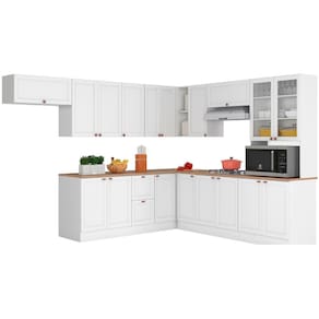 A Cozinha Modulada Completa de Canto 18 portas 2 gavetas Olivia Poliman M?veis ? uma composi??o elegante com portas almofadadas/molduradas em MDF inspirada nas cl?ssicas cozinhas americanas.