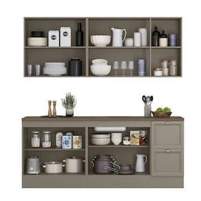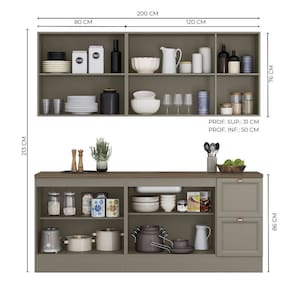 Produto com portas almofadadas/molduradas em MDF inspirada nas clássicas cozinhas americanas.Amplo espaço interno, prateleiras no aéreo triplo, duplo, balcão 1,20m e no balcão de 0,80m a prateleira é removível com espaço para acomodar objetos maiores.
