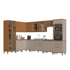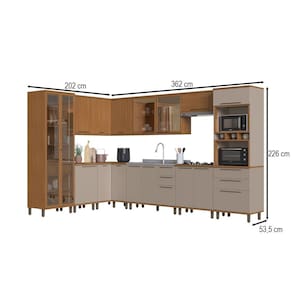 O(a) Cozinha Completa Munique 16 Portas 7 Gavetas com Vidro Freijó/Camurça - Indékes é produzido em MDP na escala de brilho Fosco, e possui um grau de dificuldade de montagem: Médio.