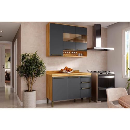 Balcão de Cozinha c/ Tampo Nápoli c/ 3 Portas e 2 Gavetas 120cm Amendoa/Grafite - Ronipa