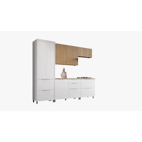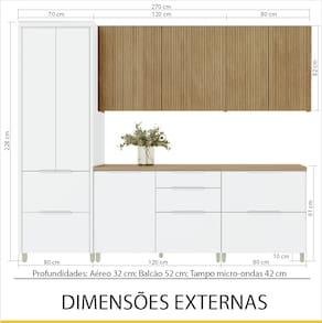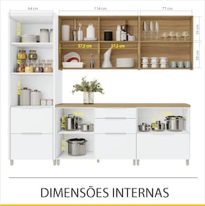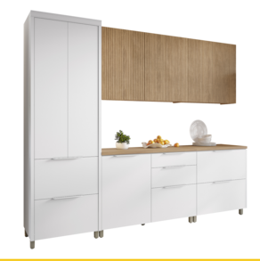 Complementando o ambiente, o Armário Aéreo Nesher Rainha está disponível em versões de 80cm e 120cm, ambos com 2 portas caneladas, puxador tipo gola/cava e 1 prateleira interna. Seu design sofisticado e dobradiças com freio anti-impacto garantem beleza e funcionalidade.