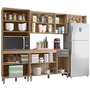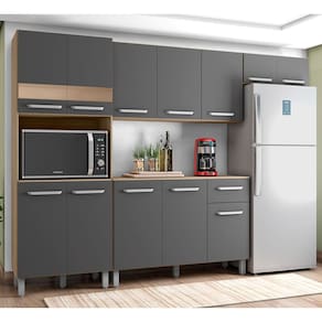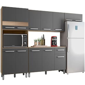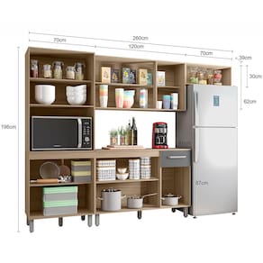 Essa cozinha da Poliman Móveis possui visual compacto e medidas que cabem em qualquer tamanho de cozinha. São 260cm de largura, 196cm de altura e 39cm de profundidade. Ao todo, são quatro peças: 1 armário aéreo, 1 armário de geladeira com porta basculante e pistão a gás, um balcão e um paneleiro torre duplo com espaço para micro-ondas.