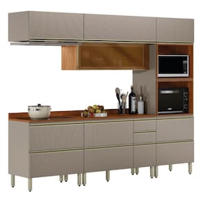 O(a) Cozinha Completa Proença 7 Portas 6 Gavetas com Vidro Nogueira/Nude Prime Tx - Demobile é produzido em MDF e Vidro na escala de brilho Fosca com Textura, e possui um grau de dificuldade de montagem: Difícil.