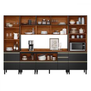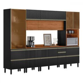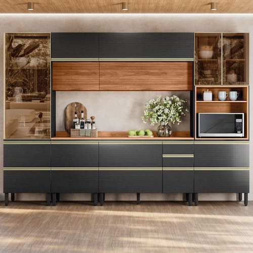 O(a) Cozinha Completa Proença 9 Portas 9 Gavetas 100% Mdf com Vidro Dp3102mf Nogueira/Carbono Prime - Demobile é produzido em 100% MDF na escala de brilho Fosca com Textura, e possui um grau de dificuldade de montagem: Difícil.