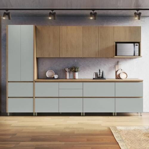 A Cozinha 7 Peças é a escolha ideal para quem busca praticidade, beleza e funcionalidade em um único ambiente. Produzida 100% em MDF, oferece um acabamento sofisticado com design moderno, puxadores embutidos e portas com acabamento canelado. Conta com 11 portas, 8 gavetas e um nicho para micro-ondas integrado, garantindo muito espaço e organização. As gavetas possuem corrediças telescópicas de abertura total e divisórias funcionais, como porta-condimentos e organizador de talheres. Os módulos têm altura e estrutura pensadas para aproveitar melhor o espaço, com pés reguláveis e prateleiras bem distribuídas. Disponível em diferentes combinações de cores, a cozinha tem montagem prática e estrutura reforçada, unindo durabilidade e estilo em cada detalhe.