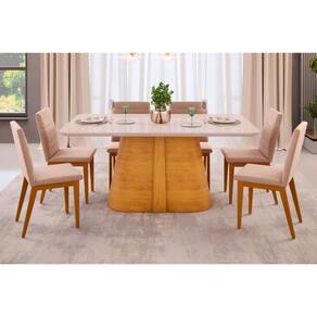 Abaixo segue os produtos do KIT: Sala de Jantar Completa Ryze Tampo Madeirado c/ Vidro Curvo 180x100cm e 6 Cadeiras Sofia Cedro/Off White - Ipe/Suede Creme - DJ Móveis