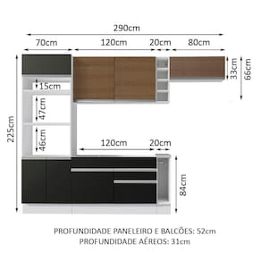 - Dimensão total do produto (AxL): 225 x 290cm | Profundidade balcões e paneleiro 52cm e aéreos 31cm