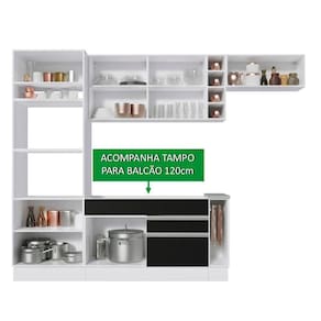 - Itens inclusos: Uma (1) torre-quente com dois (2) nichos para forno e micro-ondas, um (1) nicho menor e três (3) portas sendo uma (1) basculante; Um (1) balcão de pia com duas (2) gavetas e uma (1) porta e tampo em MDP; Um (1) balcão porta panos com tampo em MDP; Um (1) aéreo com duas (2) portas com detalhe em vidro reflex; Uma (1) mini adega; Um (1) aéreo com uma (1) porta basculante