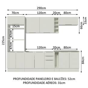 - Dimensões aprox. do produto: Altura: 225cm X Largura: 290cm X Profundidade: 52cm nos Balcões e 31cm nos Aéreos