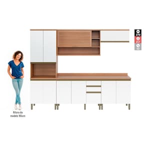 A Cozinha Completa Macadâmia é garantia de qualidade, durabilidade e muito encanto para a sua casa. Esta composição é formada por cinco módulos que remetem à estética visual e qualidade dos móveis planejados, e proporcionam um amplo espaço para organização e armazenagens de diversos itens. A escolha das ferragens é outro destaque aqui: todas as portas são equipadas com dobradiças com caneco de 35mm e sistema de amortecimento slow motion para garantir movimentos mais suaves na abertura e fechamento; já as portas basculantes possuem pistão a gás - componente que garante sustentação e segurança na usabilidade. As gavetas contam com corrediças telescópicas sinônimo de firmeza, deslizamento mais suave e abertura de extração total e divisor de talheres. O Paneleiro possui espaço para forno ou micro aquele eletro muito utilizado no dia a dia, que precisa estar ao alcance de sua mão. O Armário Aéreo de 1,20m possui porta basculante ripada, no famoso estilo veneziano, e nichos para acomodar os itens especiais. E essa versão se torna completa com os amplos Balcões - itens indispensáveis para armazenagem e preparo no dia a dia. Cozinha com jeito de planejado, mas que já está pronta para sua casa!