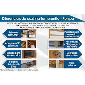 Cozinha Completa Tempranillo 16 Peças (6Aéreos+5Balcões+1Cristaleira+1TorreQuente+3Complementos) C16P80 Amendoa/Off White - Ronipa