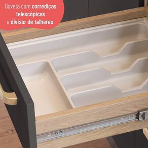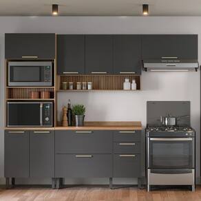 Esta Cozinha Completa com Armário e Balcão da linha Avelã vai trazer mais beleza e funcionalidade para a sua casa! Desenvolvida com forte inspiração no que há de mais atual em tendência de móveis, aqui ela é formada por quatro módulos que remetem à estética visual e qualidade dos móveis planejados. Entre os diferenciais, destaca-se a excelente escolha das ferragens: todas as portas são equipadas com dobradiças com caneco de 35mm e sistema de amortecimento slow motion para garantir movimentos mais suaves na abertura e fechamento; já as portas basculantes possuem pistão a gás - componente que garante sustentação e segurança na usabilidade. As gavetas contam com corrediças telescópicas sinônimo de firmeza, deslizamento mais suave e abertura de extração total. Outro destaque são os puxadores, que além modernos na cor Gold, são de alumínio muito mais duráveis. O Paneleiro Torre Quente é um módulo coringa para a organização - possui espaços para forno e micro, deixando seus eletros ao alcalce das mãos. O amplo Armário Aéreo de 1,20m carrega toda a personalidade da linha Avelã: o nicho com acabamento em estilo ripado é perfeito para acomodar aqueles itens especiais. E essa versão se torna ainda mais completa com o Balcão que possui duas gavetas e divisor interno de talheres. Uma cozinha praticamente planejada, mas com a praticidade de já estar pronta para levar para casa.