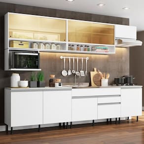 - Profundidade maior, como uma cozinha planejada: 52 cm nos módulos inferiores e 31 cm nos aéreos