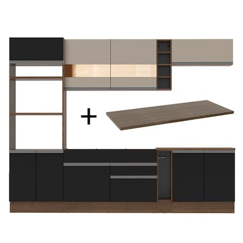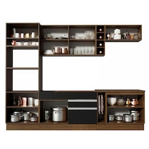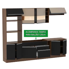 - Itens inclusos: 1 porta fornos com dois nichos para forno e micro-ondas; 3 portas sendo uma basculante; 1 balcão de pia com duas gavetas, uma porta e tampo em MDP; 1 porta panos; 1 balcão com duas portas e tampo em MDP; 1 aéreo com duas portas com detalhe em vidro; 1 aéreo com uma porta basculante; 1 mini adega