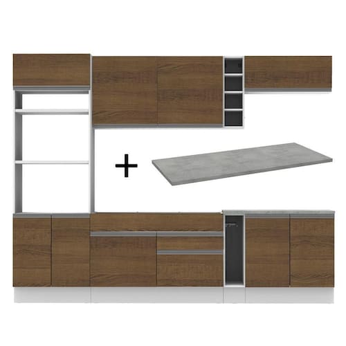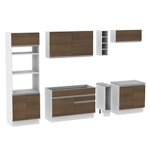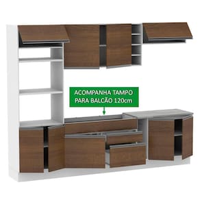 - Itens inclusos: Um (1) porta fornos com dois (2) nichos para forno e micro-ondas e três (3) portas sendo uma (1) basculante; Um (1) balcão de pia com duas (2) gavetas e uma (1) porta e tampo em MDP; Um (1) porta panos; Um (1) balcão com duas (2) portas e tampo em MDP; Um (1) aéreo com duas (2) portas com detalhe em vidro reflex; Um (1) aéreo com uma (1) porta basculante; Uma (1) mini adega