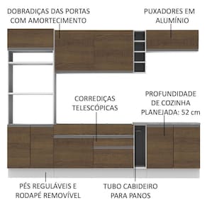 - Dimensão total do produto (AxL): 225 x 290cm | Profundidade balcões e paneleiro 52cm e aéreos 31cm