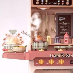 As crianças vão adorar brincar de culinária com a Cozinha de brinquedo super moderna e educativa! Gire o botão do fogão e a panela sairá vapor, acenderá luz e emitirá som que simula um fogão real! Simule a cena da culinária e desenvolva o interesse em cozinhar nas crianças. A torneira solta água de verdade! A criança pode experimentar lavar a louça de uma forma divertida. Várias formas de abrir a porta, como abertura deslizante e plana. Use o quadro negro para as crianças escrever o menu do dia. Usando a cesta, prateleira e armário ajuda no desenvolvimento da noção espacial. Estimule nas crianças a percepção visual e coordenação viso motora ao manusear os objetos da cozinha. A interação com estes brinquedos promove o contato com a realidade através do imaginário, deixando a tecnologia de lado e apostando na criatividade. Brincar de cozinhar com uma criança será divertido, muito interessante e educativo.