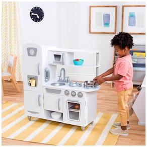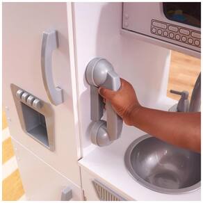 Os jovens chefs vão adorar cozinhar diversão com a nossa adorável cozinha KidKraft White Vintage Play As crianças podem se divertir por horas nesta cozinha elegante com acessórios de aparência de aço inoxidável. Há maçanetas para girar e portas para abrir para manter as crianças ocupadas imitando o que veem a mãe e o pai fazerem na cozinha. Há até um telefone para as crianças atenderem suas ligações importantes ou ligar para a entrega de pizza, se o jantar não der certo. A cor branca fresca é ótima para combinar com qualquer decoração. Também simplifica a personalização como você deseja. A pia removível é fácil de limpar e o design de madeira durável pode resistir às imaginações mais entusiásticas.