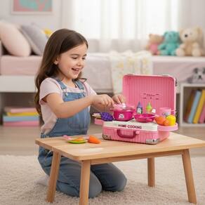 Dentro da maleta, uma surpresa: vários acessórios divertidos e educativos, como panelinhas, talheres, utensílios, alimentos de mentirinha e até um fogãozinho de brinquedo. Tudo isso feito com materiais seguros e resistentes, pensados especialmente para o universo infantil.