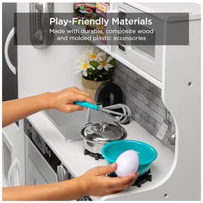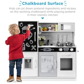 Este grande conjunto de cozinha infantil é perfeito para pequenos chefs que querem se divertir enquanto fingem cozinhar. Com um design realista que imita uma cozinha real, a superfície do quadro negro incluída permite que as crianças façam anotações enquanto brincam. O conjunto vem com 11 acessórios, incluindo utensílios, panelas, uma tampa para brincar e até uma máquina de fazer gelo que dispensa 4 cubos de gelo. Com sons realistas e recursos divertidos, como toalheiro e máquina de gelo, as crianças podem ter uma experiência verdadeira enquanto brincam. A cozinha também possui backsplash para um apelo moderno. Montar o item pode levar cerca de 90 minutos, seguindo atentamente o manual de instruções incluído. O conjunto é feito com materiais plásticos seguros e atende aos padrões de segurança federais dos EUA para ASTM CPSIA. As dimensões gerais são de 79,38 cm x 24,13 cm x 80,01 cm.