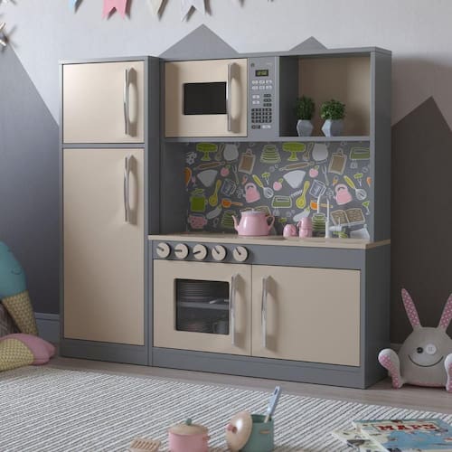 Feito em MDF 15mm. Indicado para crianças a partir de 2 anos, contém cooktop de 5 bocas com cavidades e botões que giram e inclui um forno e uma geladeira.