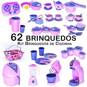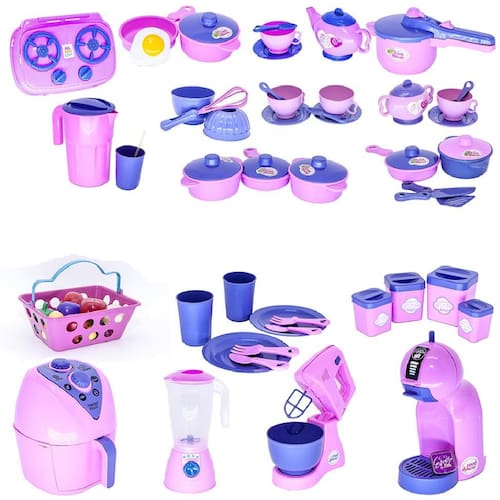 o kit vem com fogão cooktop air fryer batedeira liquidificador cafeteira com cápsula panela de pressão xícara com pires e colher açucareiro jogo de panela com talheres pratos copos talheres jarra potinhos de mantimentos e mercadinho 62pç