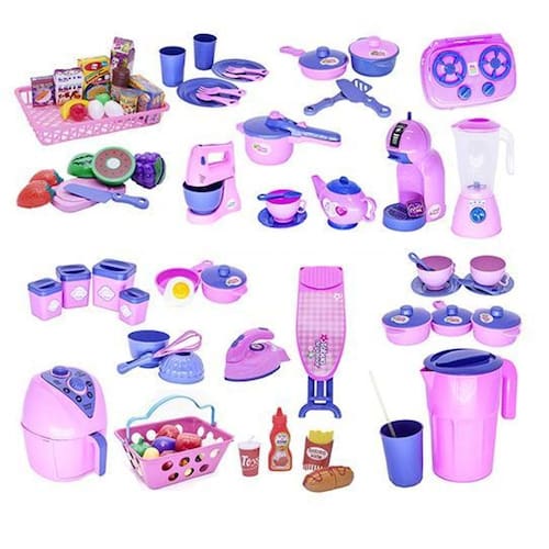 o kit vem com air fryer fogão cooktop cafeteira com cápsula jogo de panelinhas com acessório e talheres e panelinha de pressão jarra copinho com canudo potinhos de mantimentos tábua e ferro de passar roupa liquidificador batedeira com forminhas e fuê bulê com xícaras e pires e mercadinho com várias comidas, frutinhas e legumes