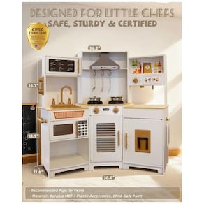 Tipo de produto: Cozinha infantil de brinquedo em madeira de canto com módulos eletrônicos?