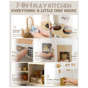 Os módulos eletrônicos incluem coifa com iluminação e efeitos sonoros, botões giratórios e detalhes que simulam funcionamento de eletrodomésticos. O conjunto acompanha panelas, frigideira e espátula de brinquedo, ampliando as possibilidades de preparo e organização de utensílios durante a brincadeira.?