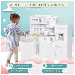 Este conjunto de cozinha infantil em formato de canto é completo com 14 acessórios, incluindo faca, garfo, colheres, panelas, frascos de tempero e alimentos como caranguejo, cebola, cogumelo, camarão, peixe e brócolis. A cozinha e a geladeira são removíveis para serem colocadas em qualquer lugar. O design da cozinha imita uma cozinha real, com pia que pode armazenar água e armário com porta que pode ser aberta e equipado com um dispensador eletrônico de água, proporcionando uma experiência realista e divertida para as crianças. Além disso, este brinquedo de cozinha é educacional, permitindo que as crianças desenvolvam habilidades como coordenação olho mão e criatividade. Feito de pinho e placa de MDF nível P2, é seguro para crianças acima de 3 anos. As dimensões gerais da cozinha infantil são 85,72 cm x 64,14 cm x 84,45 cm.