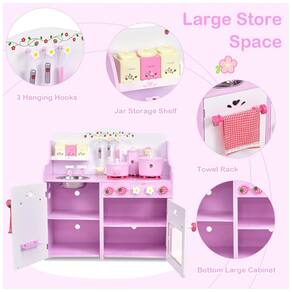 O conjunto oferece uma experiência de cozinha realista, com eletrodomésticos de mentira, botão clicável do fogão e forno para cozinhar ingredientes de mentira, torneira, pia removível, toalheiro, toalha e outros gadgets. Possui ainda grande espaço de armazenamento, com porta embaixo da pia e espaço no forno para guardar alimentos ou utensílios de cozinha.