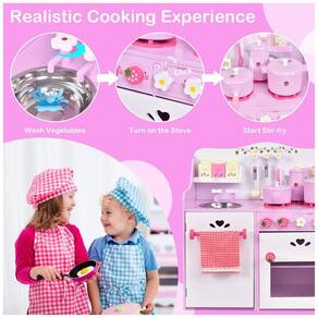 Este é um lindo conjunto de cozinha com tema de morango rosa, perfeito para crianças que adoram brincar de cozinhar. Feito com madeira maciça de pinho e MDF, é durável e estável para suportar anos de uso. A tinta utilizada é adequada para crianças e inodora. São 13 acessórios incluídos, como utensílios de cozinha, potes de tempero, panelas, chaleira, pia e toalha, feitos em madeira maciça de alto acabamento, permitindo que as crianças mergulhem em uma aventura gastronômica imaginativa.