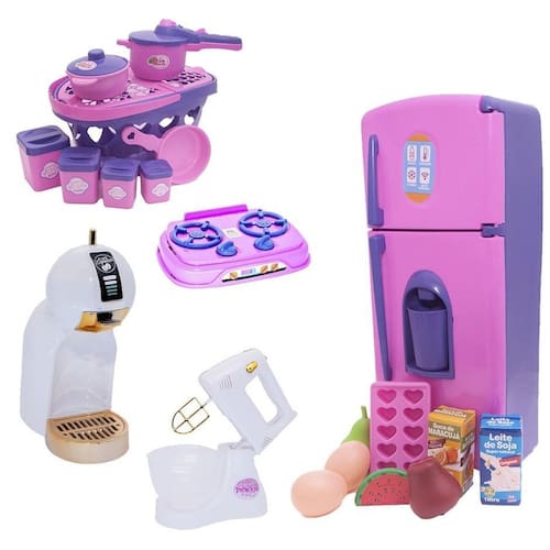 O kit vem com geladeira com comidinhas diversas, jogo de panelas, potinhos de mantimentos, cafeteira, fogão cooktop, batedeira