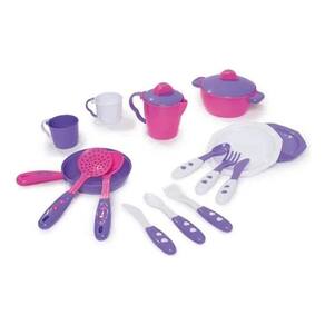 Conteúdo da embalagem: 1 Cozinha Mini Chef com água 2 abas laterais 1 Panelinha com tampa 1 Leiteira com tampa 1 frigideira 2 Pratos 2 Xícaras 2 Facas 2 Garfos 2 Colheres 1 concha 1 espumadeira