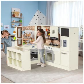 A cozinha combinada tem prateleiras, armários, ganchos e alças para ajudar as crianças a desenvolver o hábito de separar e organizar brinquedos. A máquina de lavar louça, os fornos e a geladeira também são ótimos lugares para guardar os brinquedos. O design walkin oferece espaço suficiente para várias crianças brincarem e interagirem ao mesmo tempo.