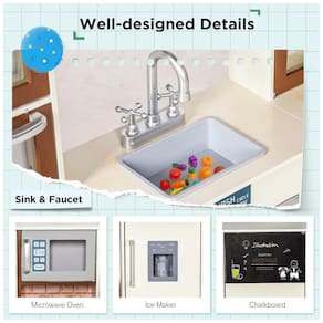 Este conjunto de cozinha infantil grande de 3 peças é feito de MDF premium e material ecológico para garantir sustentabilidade e longo tempo de serviço. O elegante acabamento branco e marrom usa tinta adequada para crianças. A superfície sem rebarbas e os cantos arredondados existem para evitar arranhões inesperados.