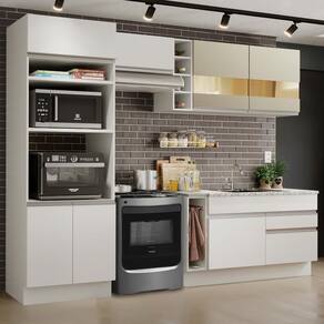 - Itens inclusos: 1 Torre-quente com dois nichos para forno e micro-ondas | 1 nicho menor e três portas, sendo uma basculante | 1 Armário aéreo com uma porta basculante | 1 Adega | 1 Armário aéreo com duas portas com detalhe em vidro Reflex | 1 Balcão porta-panos com tampo de MDP em pintura Mood | 1 Balcão de pia com duas gavetas e uma porta, não acompanha tampo