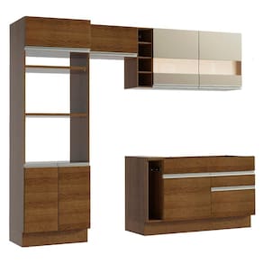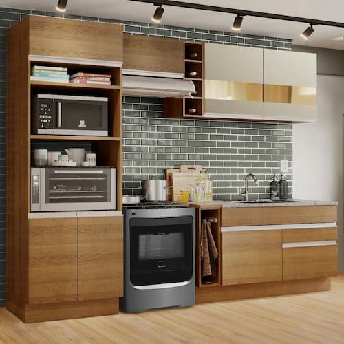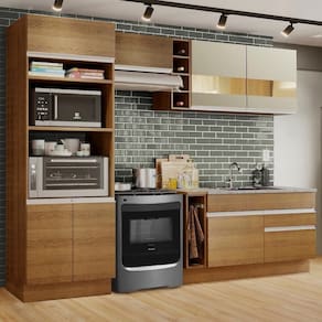- Itens inclusos: 1 Torre-quente com dois nichos para forno e micro-ondas | 1 nicho menor e três portas, sendo uma basculante | 1 Armário aéreo com uma porta basculante | 1 Adega | 1 Armário aéreo com duas portas com detalhe em vidro Reflex | 1 Balcão porta-panos com tampo de MDP em pintura Mood | 1 Balcão de pia com duas gavetas e uma porta, não acompanha tampo