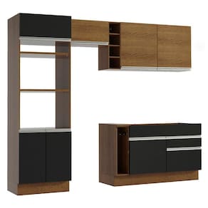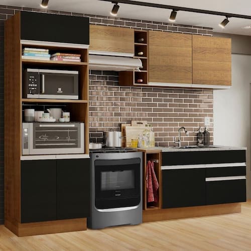 - Itens inclusos: 1 Torre-quente com dois nichos para forno e micro-ondas | 1 nicho menor e três portas, sendo uma basculante | 1 Armário aéreo com uma porta basculante | 1 Adega | 1 Armário aéreo com duas portas com detalhe em vidro Reflex | 1 Balcão porta-panos com tampo de MDP em pintura Mood | 1 Balcão de pia com duas gavetas e uma porta, não acompanha tampo