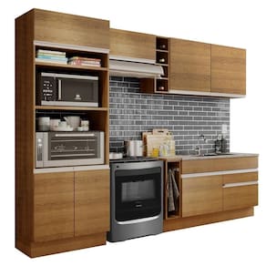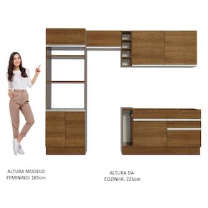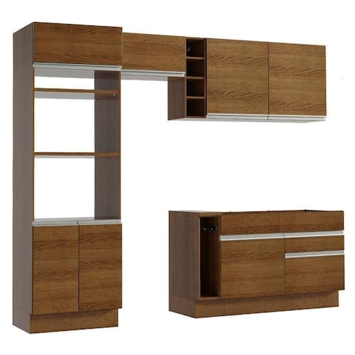 - Itens inclusos: 1 Torre-quente com dois nichos para forno e micro-ondas | 1 nicho menor e três portas, sendo uma basculante | 1 Armário aéreo com uma porta basculante | 1 Adega | 1 Armário aéreo com duas portas com detalhe em vidro Reflex | 1 Balcão porta-panos com tampo de MDP em pintura Mood | 1 Balcão de pia com duas gavetas e uma porta, não acompanha tampo