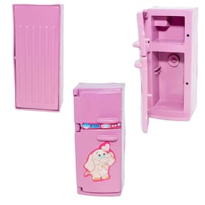 - tamanho da geladeira: 19 cm de altura x 8cm de largura x 7 cm de profundidade ------------------------------------------------------------------------------------------------------------------------- - 6 talheres - 4 comidinhas - 1 tábua -1 fogão cooktop - 2 panelinhas -------------------------------------------------------------------------------------------------------------------------- - 1 caixinha de suco de uva, - 1 caixinha de leite integral, - 1 caixinha de cereal, - 1 caixinha de macarrão instantâneo, - 1 caixinha de cookies de chocolate, - 2 ovos - 2 pimentões - 1 banana. - 1 lata de milho - 1 lata de achocolatado - material: plástico e papelão - 1 cestinha