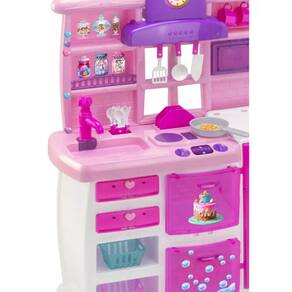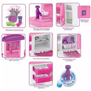 Ela vem com Fogão, Micro-ondas , Lava - Louça com porta abre e fecha, Gavetas e Geladeira com dispenser de água e acessórios: Panelinha, Pratos, Talheres, Conchas e Escumadeira , Copo , Forminhas de gelatina.