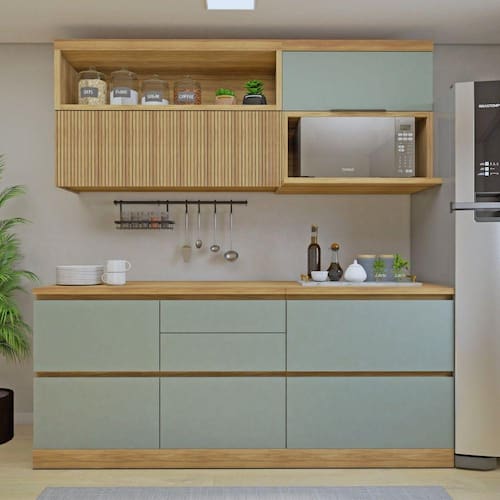 * Balcão com puxadores tipo gola/cava. Leveza e sofisticação do inicio ao fim. Acabamento da Prateleira: Impressão Escala de Brilho da Prateleira: Fosco Acabamento da Gaveta: Impressão Escala de Brilho da Gaveta: Fosco Acabamento da Porta: Impressão Escala de Brilho da Porta: Fosco Acompanha Tampo: Sim Ambiente Principal: Cozinha Complexidade da Montagem: Alta: deve ser montado por um montador especializado Cor: Marrom/Verde Cor do Produto: Marrom/Verde Escala de Brilho: Fosco Espessura do Material da Estrutura: 15 mm Espessura do Tampo: 15 mm Gaveta com Chave: Não Informações Complementares: Rodapé 100% Mdf, com uma altura de 10cm. Destaque-se pela sapata que percorre toda a extensão do rodapé e a aplicação de fita de borda entre a peça e a sapata plástica , protegendo a peça do contato direto com o chão, desdempenham um papel fundamental na Itens Inclusos: 1 Cozinha, manual de montagem e kit ferragens. Linha ou Coleção: Millena Manual de Montagem e Instalação: https://product-hub-prd.madeiramadeira.com.br/894678/documents/338c4472-f529-4ae4-85ec-8ca66ee8e2f6REO20MICRO20COM20RODAPC389.pdf Material da Dobradiça/Corrediça da Porta: Metálica Material da Gaveta: MDF Material da Porta: MDF Material da Prateleira: MDF Material do Fundo: MDF Material do Tampo: MDF Material dos Pés: MDF Medida de cada item (A x L x P): Balcão 1 Porta 120cm - 91cm x 120cm x 52cmBalcão 1 Porta 80cm - 91cm x 80cm x 52cmAereo 1 Porta Bascula 120cm - 82cm x 120cm x 32cmAereo 1 Porta 80cm - 82cm x 80cm x 42cm modular: Sim Necessita Montagem: Sim O Balcão Acompanha Pia: Não Origem do Produto: Nacional Pés Reguláveis: Não Peso: 161,38 kg Peso Máximo por Gaveta: 5 kg Peso Máximo por Prateleira: 10 kg Possui Pés: Rodapé Possui Portas: Sim Possui Prateleiras: Sim Possui recorte para Cooktop: Não Possui Rodízio: Não Possui Vidro: Não Recomendações de Uso, Manutenção e Limpeza: Utilizar pano macio levemente umedecido e na sequencia pano macio seco. Sapatas Niveladoras: Não Sistema de Montagem: Parafusos, minifix e cavilhas. Tipo de Corrediça da Gaveta: Telescópica Tipo de Dobradiça da Porta: 35 mm Tipo de Puxador da Gaveta: Embutido Tipo de Puxador da Porta: Embutido