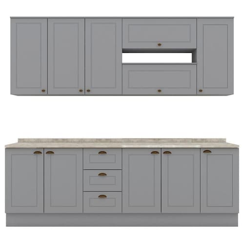 Cozinha modulada inspirada nas clássicas cozinhas com conceito americano. Conjunto com 10 peças: 1 balcão de pia 120 cm (com tampo de 120 cm), 1 balcão de 80 cm (com tampo de 80 cm), 1 balcão de 40 cm (com tampo de 40 cm), 1 armário aéreo de 120 cm, 2 armários aéreos basculantes de 80 cm e 1 armário aéreo de 40 cm.