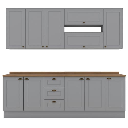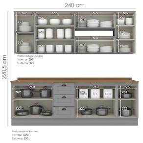 Cozinha modulada no estilo das clássicas cozinhas com conceito americano. Um conjunto modular de cozinha sendo 10 peças: 1 balcão de pia 120 cm (com tampo de 120 cm), 1 balcão de 80 cm (com tampo de 80 cm), 1 balcão de 40 cm (com tampo de 40 cm) 1 armário aéreo de 120 cm, 2 armários aéreos basculantes de 80 cm e 1 armário aéreo de 40 cm. Todo o conjunto com estrutura feita 100% MDF de 15mm (fundo com 3mm, tampos em MDF de 25mm), portas com dobradiças metálicas 35 mm com amortecimento, total de 8 prateleiras suportando até 8 kg. Acabamento em pintura UV texturizada (fosco), portas e gavetas com detalhes de usinagem em baixo relevo, além do destaque em seus puxadores em metal zamac. Opção de instalação sem pés, suspenso (ferragens para fixação na parede inclusas). Este móvel chegará na sua casa separado em 10 volumes.